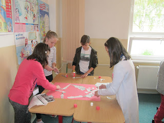 Tools/Materials: colourful dice and paper (A3 format), newspaper, glue, 2 tables, chairs